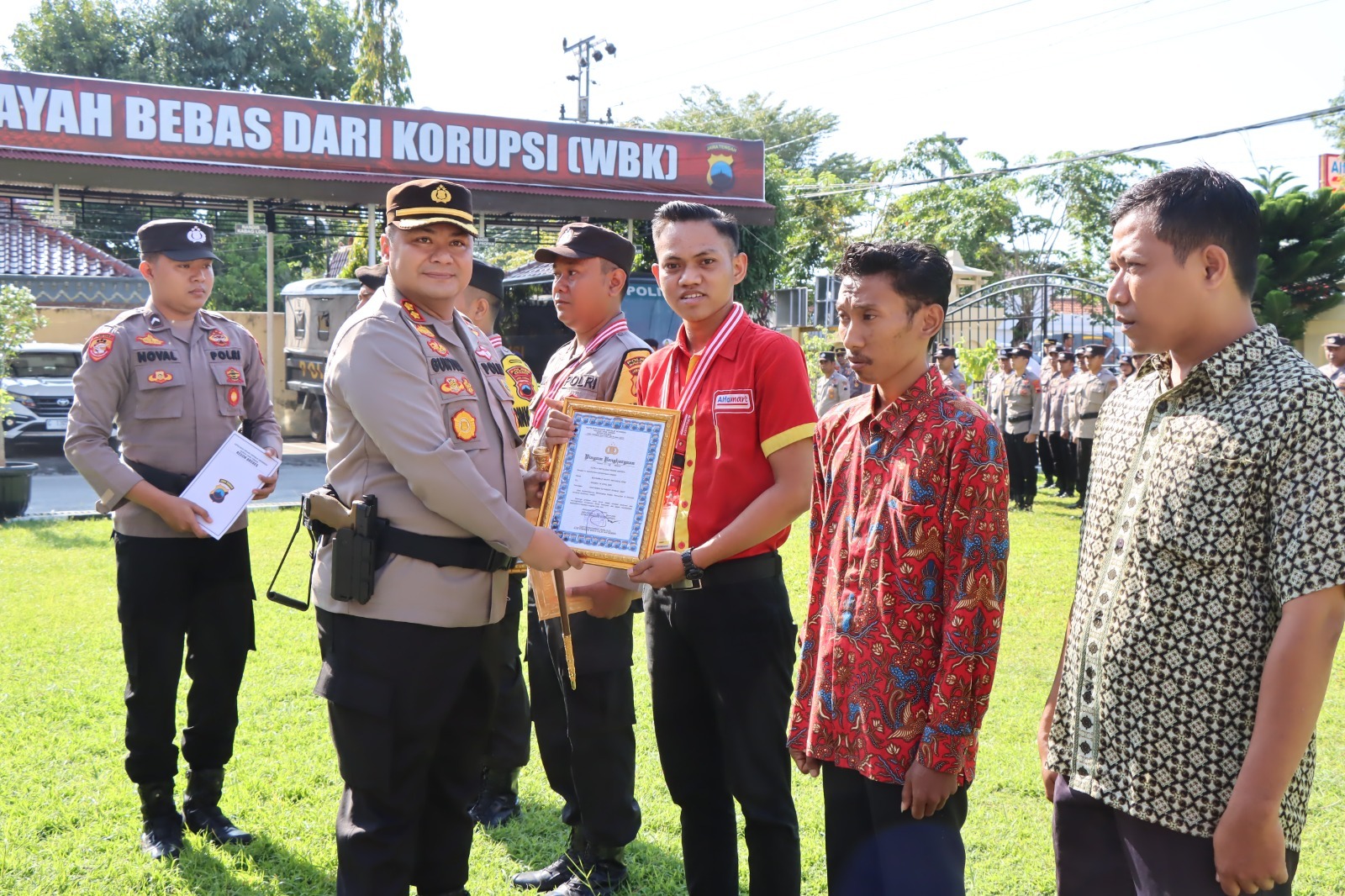 Pemberian penghargaan kepada Mohammad Wahyu (23), karyawan Alfamart jalan jenderal Sudirman tersebut dilakukan bersama dengan pemberian reward (pernghargaan) anggota Polres Brebes dalam sebuah apel yang dilaksanakan dihalaman Mapolres Brebes, Senin (13/3/2023).