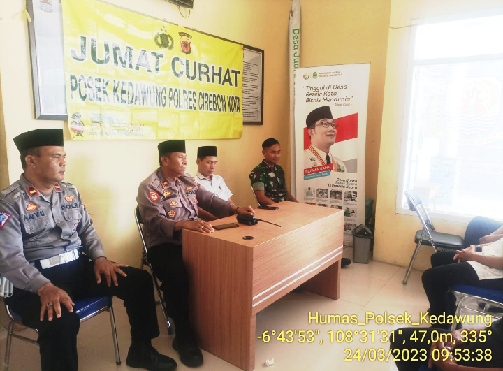 Dalam kegiatan Jumat Curhat tersebut juga, guna menerima aspirasi masyarakat sekitar sekaligus juga untuk memberikan himbauan kamtibmas sehingga terciptanya situasi kamtibmas yang aman kondusif warga masyarakat. ”Tambah Kasi humas Polres Cirebon Kota IPTU Ngatidja. SH.MH