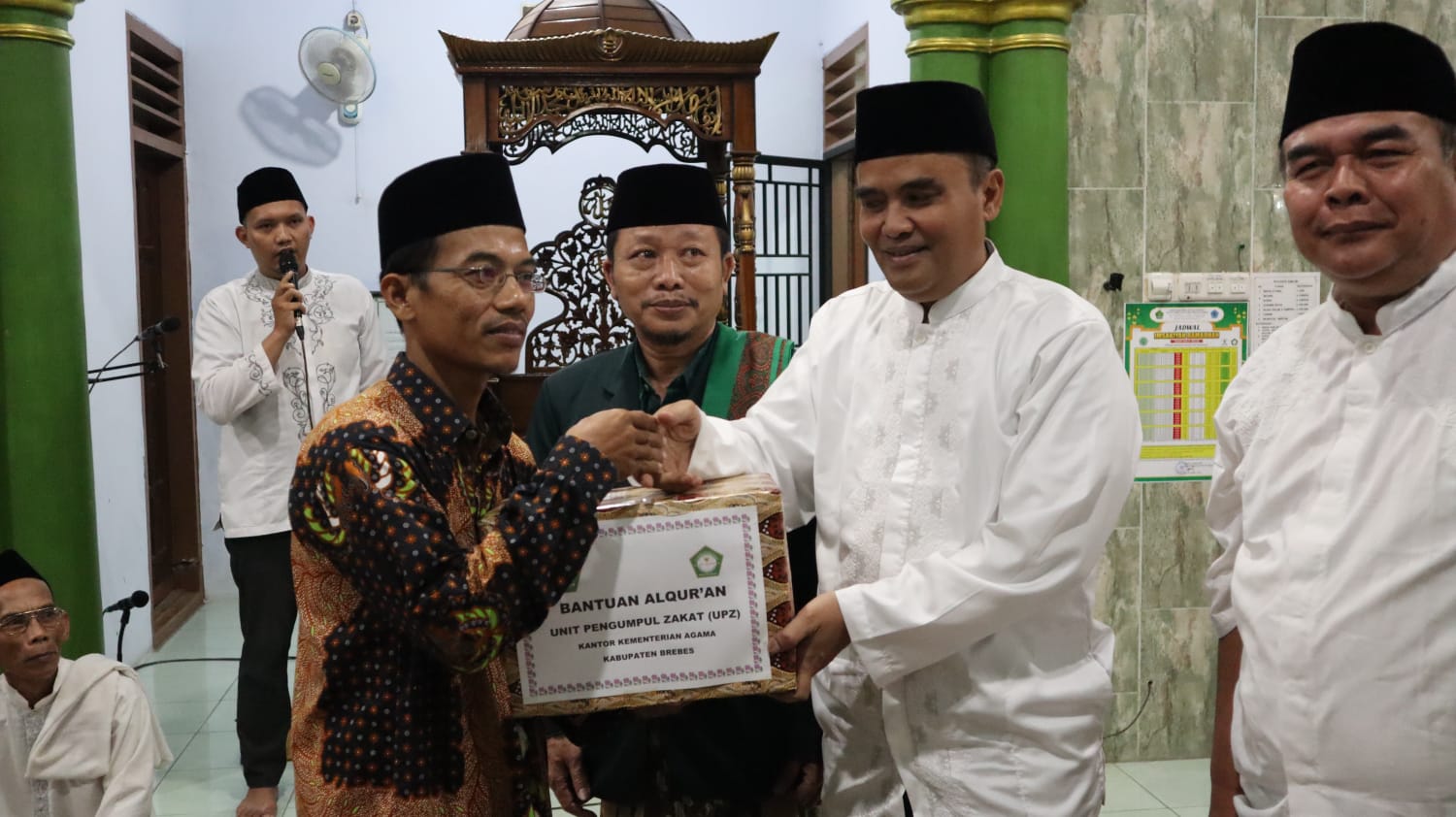 Dalam kesempatan tersebut dibagi santunan kepada anak yatim piatu dan kaum dhuafa dari Baznas Kab Brebes, pemberian Mushaf Al Quran kepada Takmir Masjid dari Kantor Kemenag Brebes.