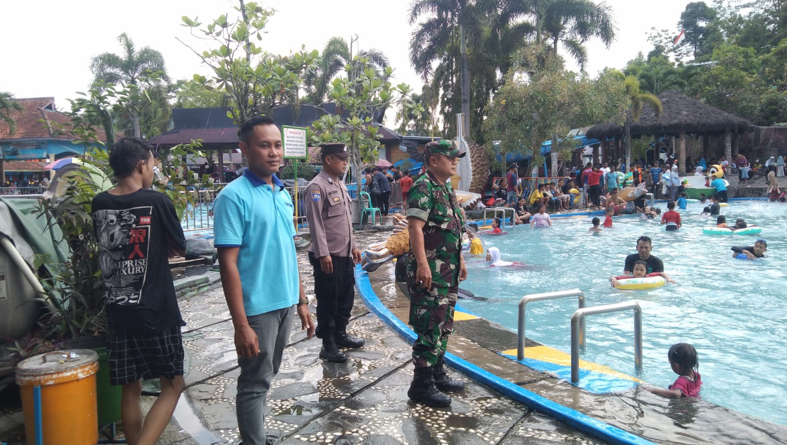 Seperti yang terlihat, petugas melaksanakan patroli dan juga himbauan kepada pengunjung objek wisata curug cipeteuy fan kolam renang tirta indah.