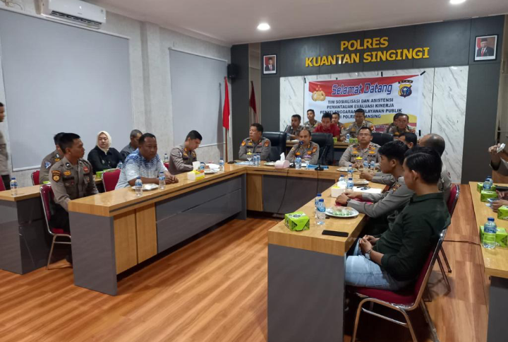 Tim sosialisasi dan asistensi dari Polda Riau melaksanakan kegiatan pemantauan evaluasi kinerja penyelenggaraan pelayanan publik di Polres Kuantan Singingi, Sabtu (6/5/23), Pagi, di Ruang Rupatama Polres Kuansing.