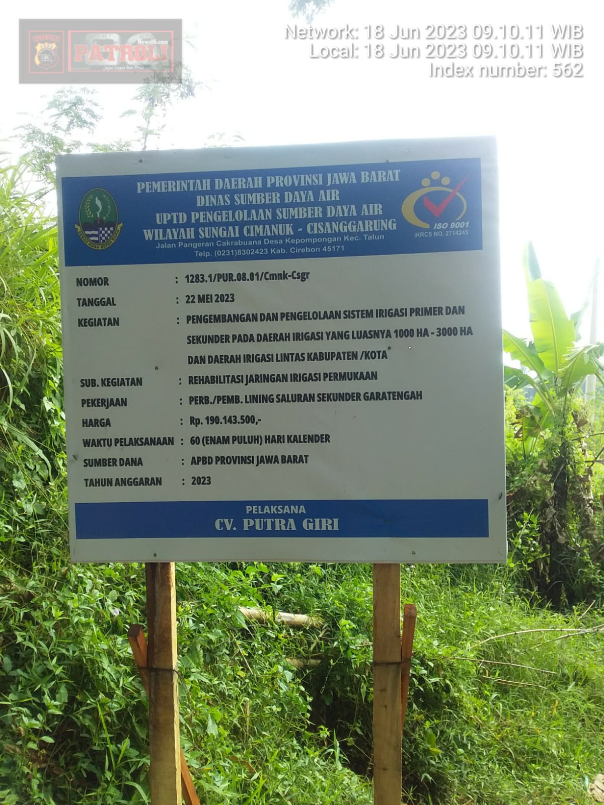 Kuningan:Patrolinews86.com –  Melihat Pembangunan proyek dilapangan terkait dengan kegiatan pembangunan proyek penahan tanah yang kini lagi dilaksanakan  oleh CV. PUTRA GIRI, kini  Sedang giat giatnya Sucseskan Kegiatan Pengembangan dan Pengelolaan Sistem Irigasi Primer dan Sekunder Pada Daerah Irigasi yang Luasnya 1000 HA – 3000 HA  Daerah Irigasi Lintas Kabupaten/Kota, Minggu,(18/6/23).