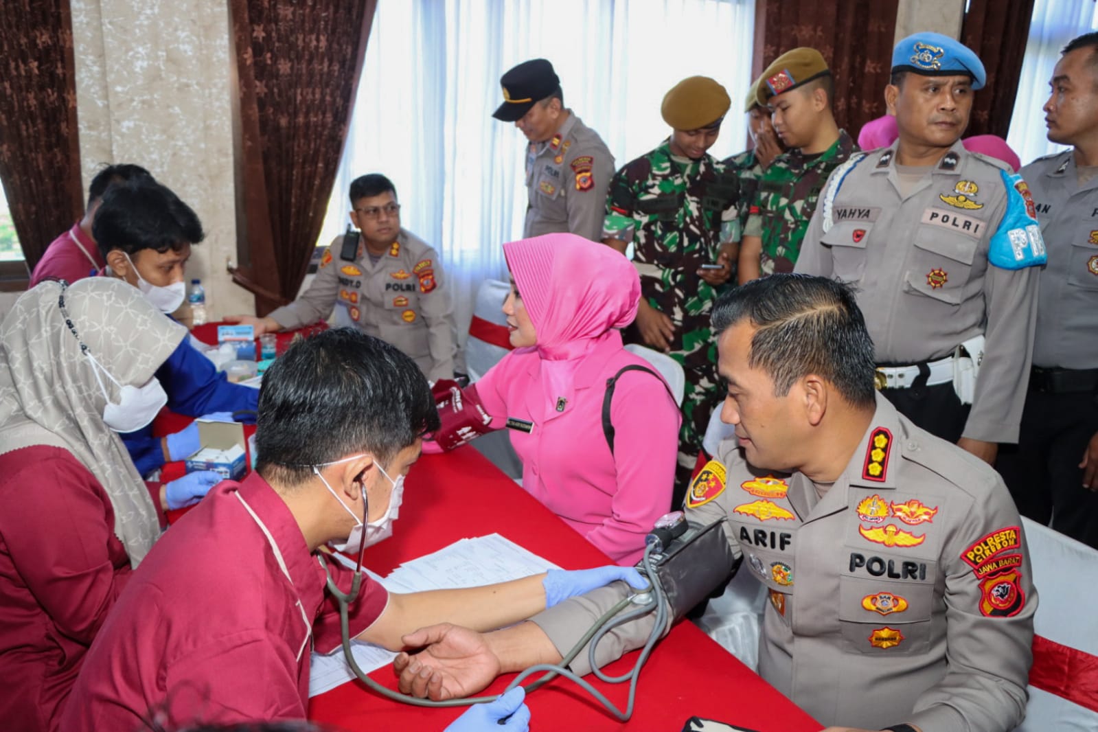 Polresta Cirebon menggelar donor darah dalam rangka peringatan Hari Bhayangkara ke-77, Selasa (20/6/2023). Kegiatan bakti kesehatan yang bekerja sama dengan PMI Kabupaten Cirebon tersebut dilaksanakan di Aula Pesat Gatra Mapolresta Cirebon.