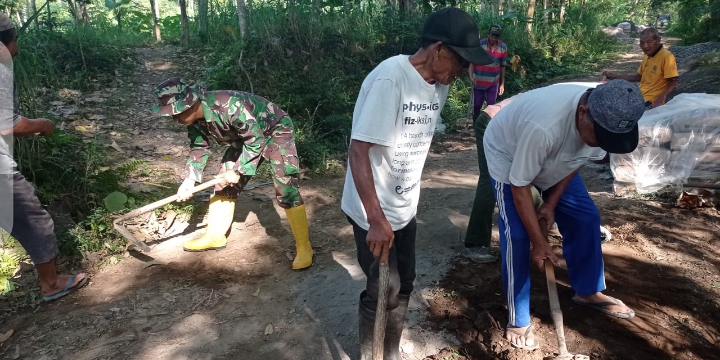 Babinsa Koramil 04/Teras Kodim 0724/Boyolali Sertu Suyamto bersama warga bergotong royong dalam rangka perbaikan jalan desa di Dukuh Ngemplak Desa Tawangsari Kecamatan Teras Kabupaten Boyolali, ( 22/07/2023)