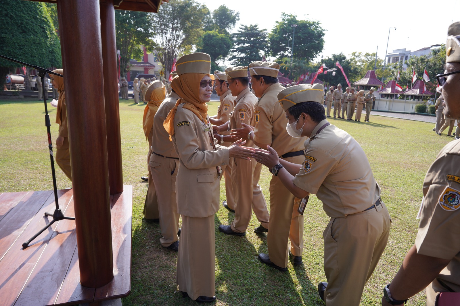 Usai apel, seluruh peserta apel bersalaman dengan PNS yang memasuki purna tugas.