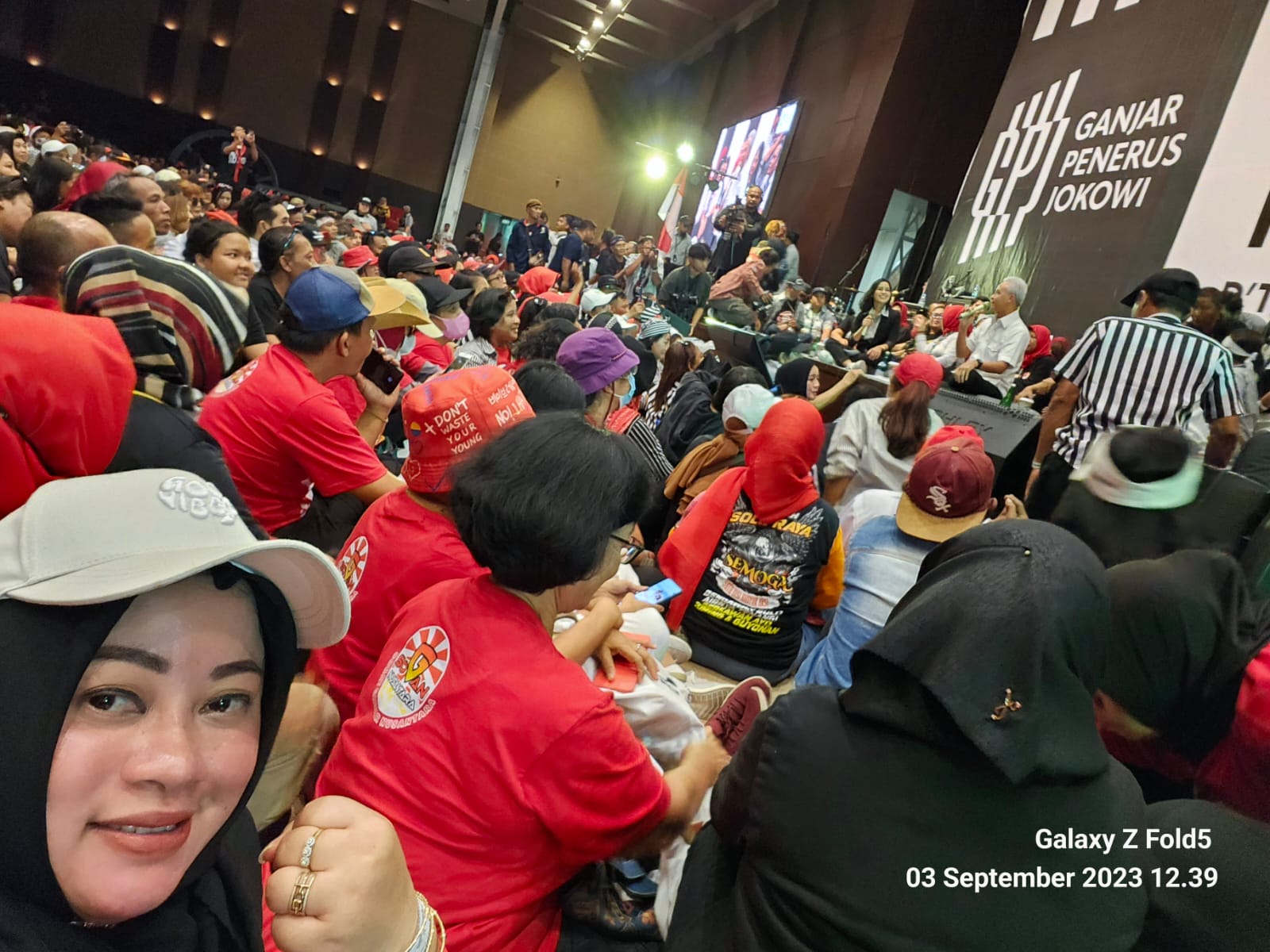 Massa yang tergabung dalam wadah Relawan Ganjar Pranowo memenuhi Townhall Meeting De Tjolomadoe , minggu (03/09/2023),