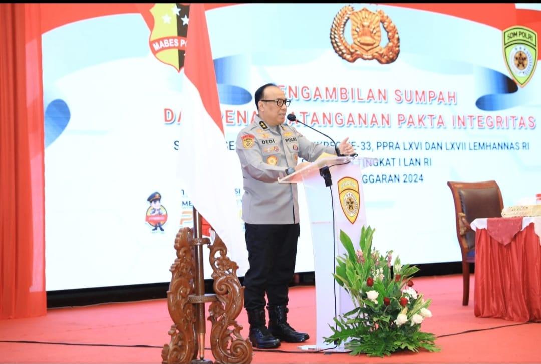 Untuk itu kata mantan Kadiv Humas Polri ini untuk mengawali pelaksanaan seleksi Dikbangpimti 2024, telah dilakukan Pengambilan Sumpah dan Penandatanganan Pakta Integritas seleksi Prodik Sespimti Polri Dikreg ke-33, PPRA LXVI dan LXVII Lemhanas RI serta PKN TK-I LAN RI T.A. 2024 di Auditorium STIK, Senin kemarin. Kegiatan dihadiri oleh para pejabat utama SSDM Polri, pengawas internal dan eksternal, panitia tingkat pusat dan daerah, serta peserta seleksi di Satker Mabes Polri dan Polda jajaran baik yang hadir langsung maupun secara daring.
