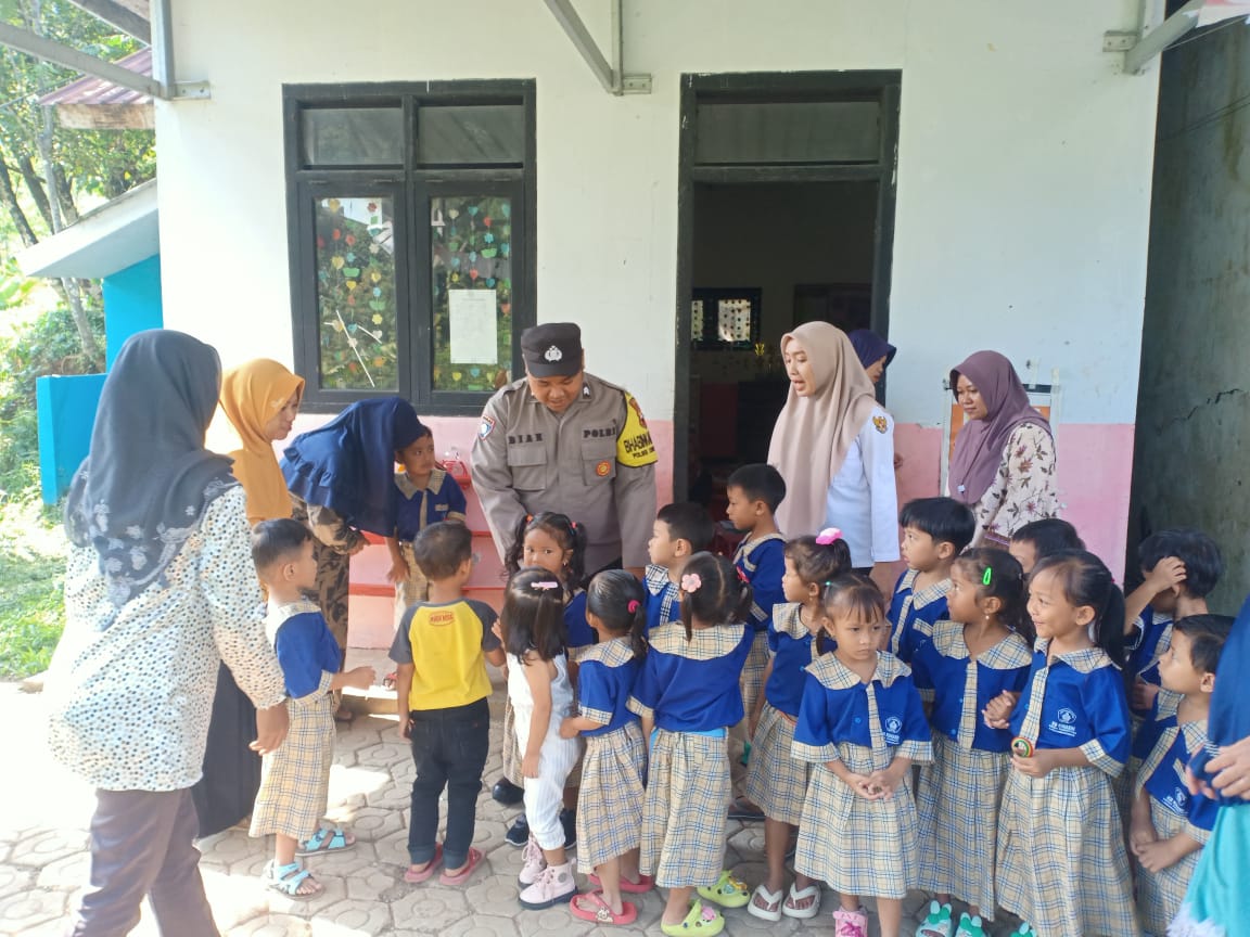 Pada kesempatan menyambangi Paud tersebut, anak-anak asyik belajar dengan dibimbing para guru pengajar yang mendampinginya. Kehadiran Bhabinkamtibmas Briptu Subi disambut dengan ceria oleh anak-anak Paud.