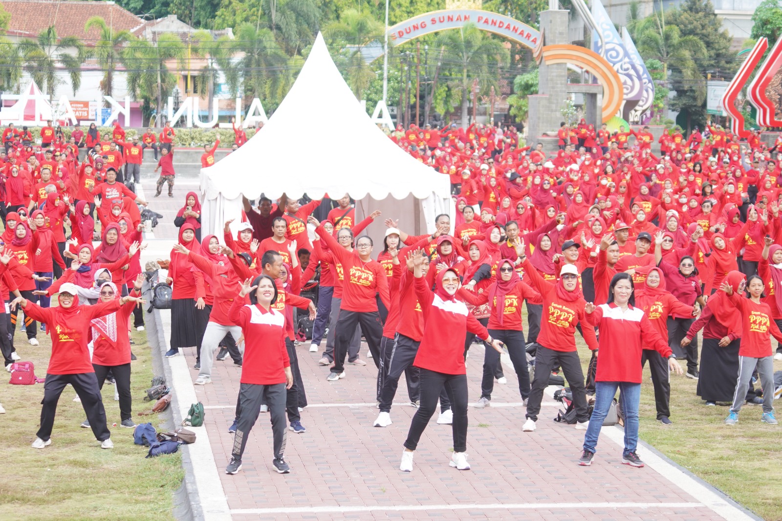 Peringati Hari Guru Nasional 2023, ribuan guru ikuti senam bersama Bupati Klaten. Turut hadir Forkopimda, Kepala OPD, Kepala OPD, Camat, Dirut BUMD, Korwil Pendidikan, Guru Paud, SD, SMP, hingga SMA/SMK di Alun-Alun Klaten, Jum’at (24/11/2023).