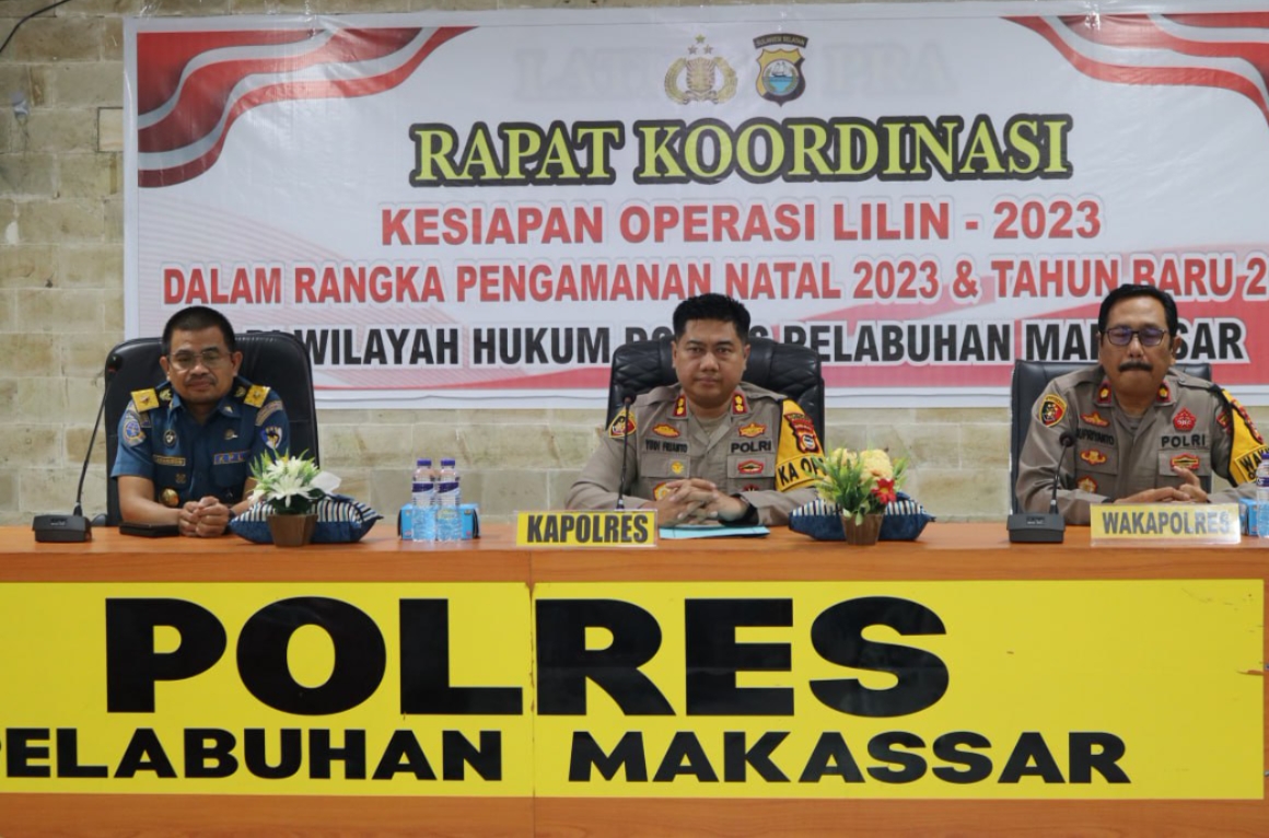 Makassar, Patrolinews86.com-Menyambut libur Natal 2023 dan tahun baru (Nataru) 2024 serta persiapan pelaksanaan Operasi 2023, Polres Pelabuhan Makassar merapatkan barisan bersama pemangku kepentingan (Instansi terkait) dengan menggelar rakor lintas sektoral, Rabu (20/12/2023)