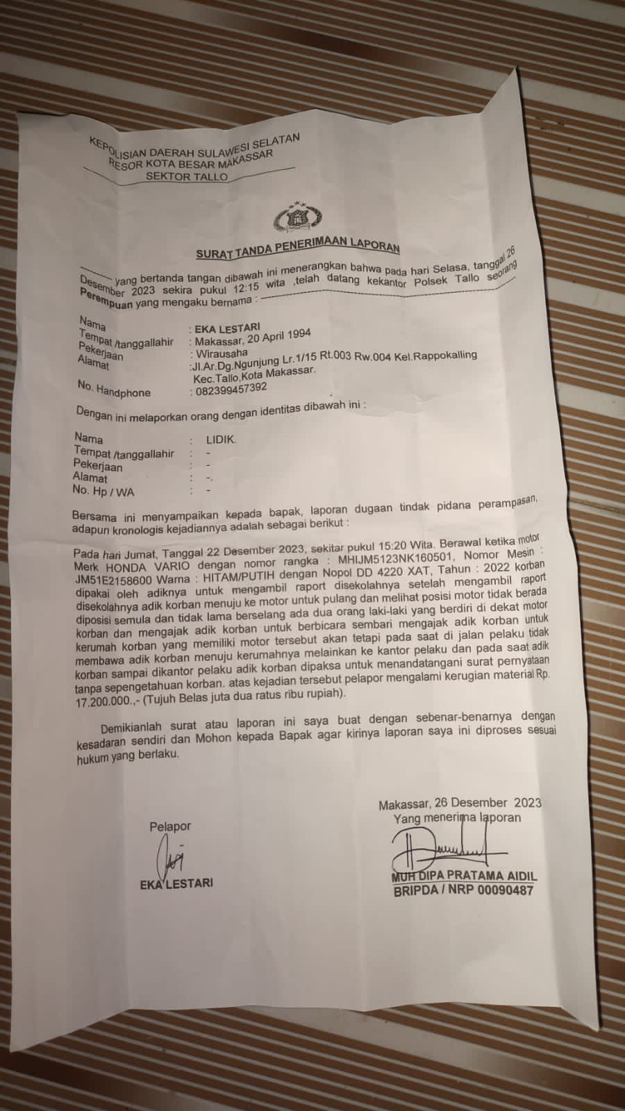 merasa tidak puas dengan hasil keputusan dari pihak wom Finance Makassar Eka lestari melakukan pelaporan di wilayah hukum Polsekta Tallo Makassar .