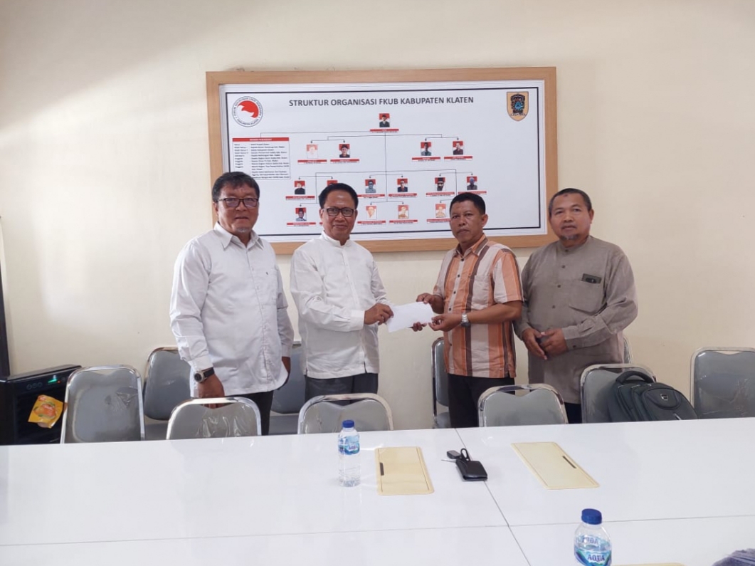 Penyerahan secara simbolis bantuan stimulan untuk PKUB Kecamatan masing-masing Rp 2,5 juta rupiah dari FKUB Kabupaten Klaten Jumat ( 29 /12/2023) dilakukan Syamsuddin Asyrofi didampingi wakil Ketua H.Basuno dan Sekertaris Moch.Isnaeni.