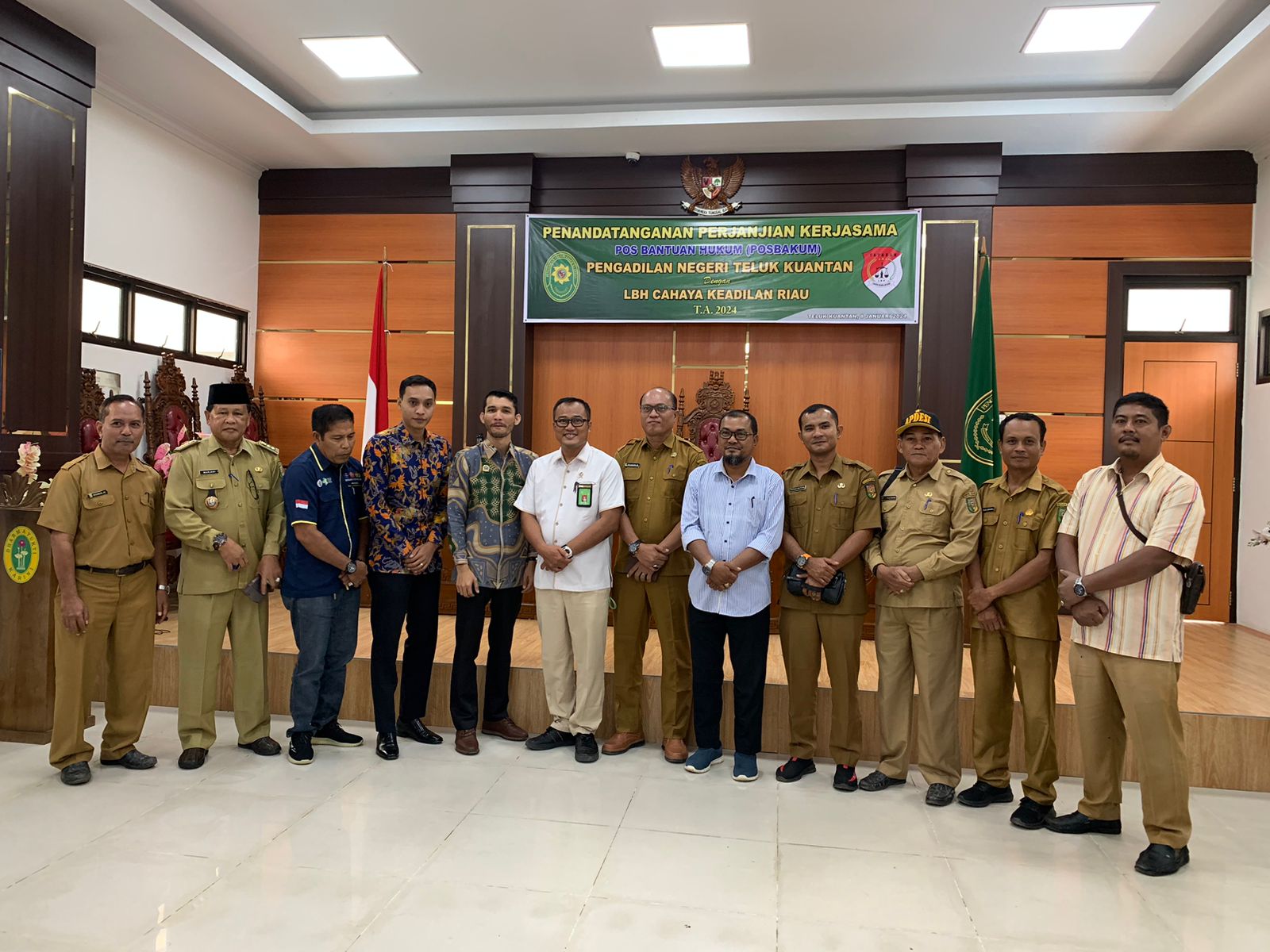 “posbakum Pengadilan Negeri Teluk Kuantan Tahun Anggaran 2024 menanda tangani kerjasama dengan Lembaga Bantuan Hukum (LBH) Cahaya Keadilan Riau yang hari ini akan di tanda tangan langsung “.