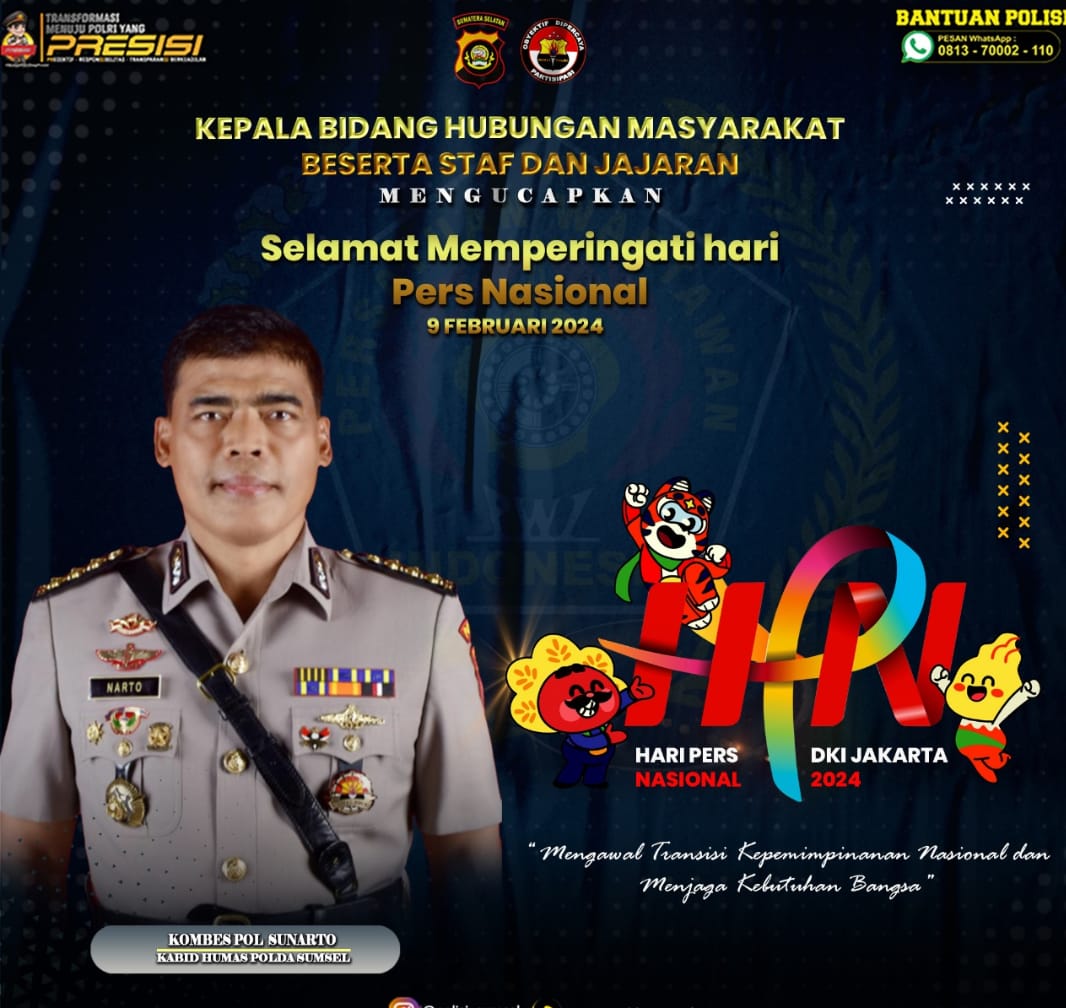 Terkait hal itu, Kabid Humas Polda Sumsel Kombes Pol Sunarto melalui Plt Kasubbid Penmas Bidhumas Polda Sumsel Kompol Astuti,Sos , Jumat siang (9/02/2024) menyampaikan ucapan selamat hari pers Nasional kepada seluruh insan pers yang ada di Jajaran Polda Sumsel Sumsel