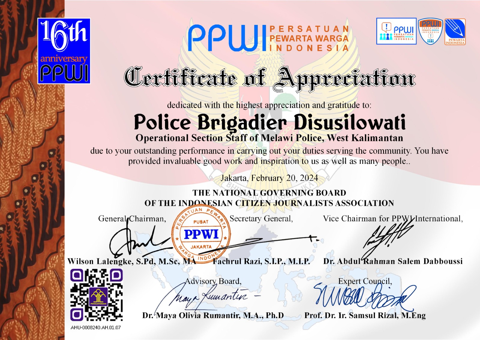 Salah satu bentuk apresiasi tersebut diberikan oleh Ketua Umum PPWI, Wilson Lalengke, atas dedikasi anggota Polwan, Brigadir D Susilowati, yang akrab disapa Nuri, Bagian Operasi Polres Melawi, Kalimantan Barat yang tetap menjalankan tugasnya meski hamil tua hingga melahirkan disaat sedang bertugas.