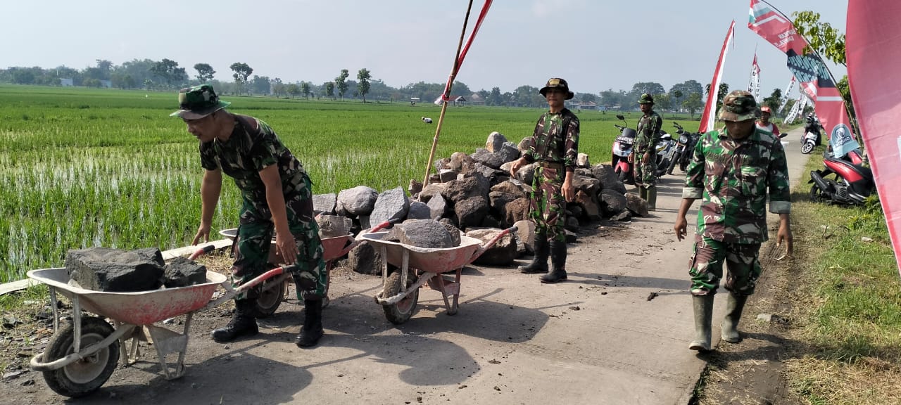 Pasiter Kodim 0726/Sukoharjo Kapten Czi Hartono menyampaikan, anggota Kodim 0726/Sukoharjo bersama warga mengangkat material batu belah untuk bahan material talud di sebelah sisi kiri jalan.