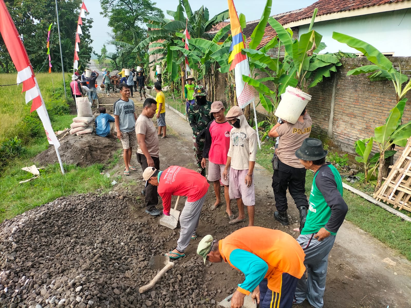 Gotong royong dalam melaksanakan pengecoran jalan bersama masyarakat di Desa Gedongan, Kecamatan Plupuh, Kabupaten Sragen juga mendidik untuk menumbuhkan semangat gotong royong, disiplin, budaya antri dan semangat cinta tanah air. Seperti yang terlihat, antrian warga dengan semangat kerja keras dalam pengerjaan cor blok jalan dengan alat seadanya ember bekas cat untuk mengangkut batu koral kemudian untuk dicampurkan kedalam adukan semen di mesin molen. Tentu bukan pekerjaan ringan, keringat pun mengucur dari badan, rasa lelah dan lapar tentunya pasti dirasakan. Namun, tetap terlihat semangat kerja keras masyarakat dan Tim Stagas dalam bergotong royong membangun Desa.Jumat(01/03/2024).