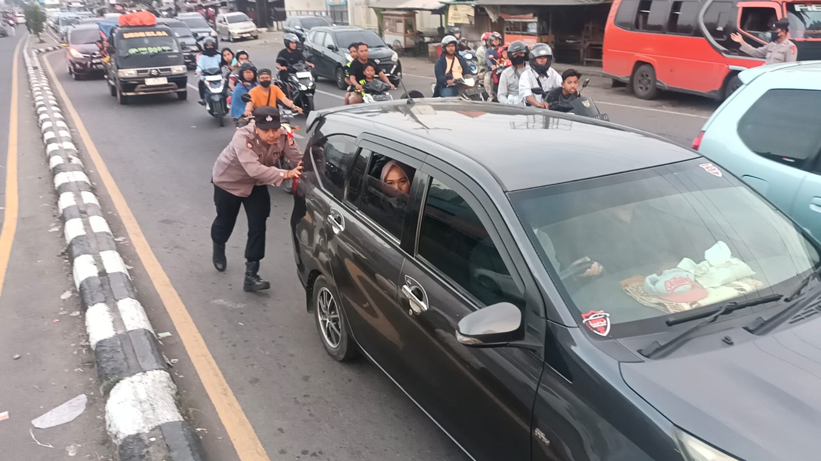 Aksi kemanusiaan ditunjukkan personel Pos Pam Palimanan Polresta Cirebon yang saat itu sedang melaksanakan pengamanan Operasi Ketupat Lodaya 2024 dengan membantu mobil pemudik yang mengalami mogok di Kecamatan Palimanan, Kabupaten Cirebon, Minggu (14/4/2024).