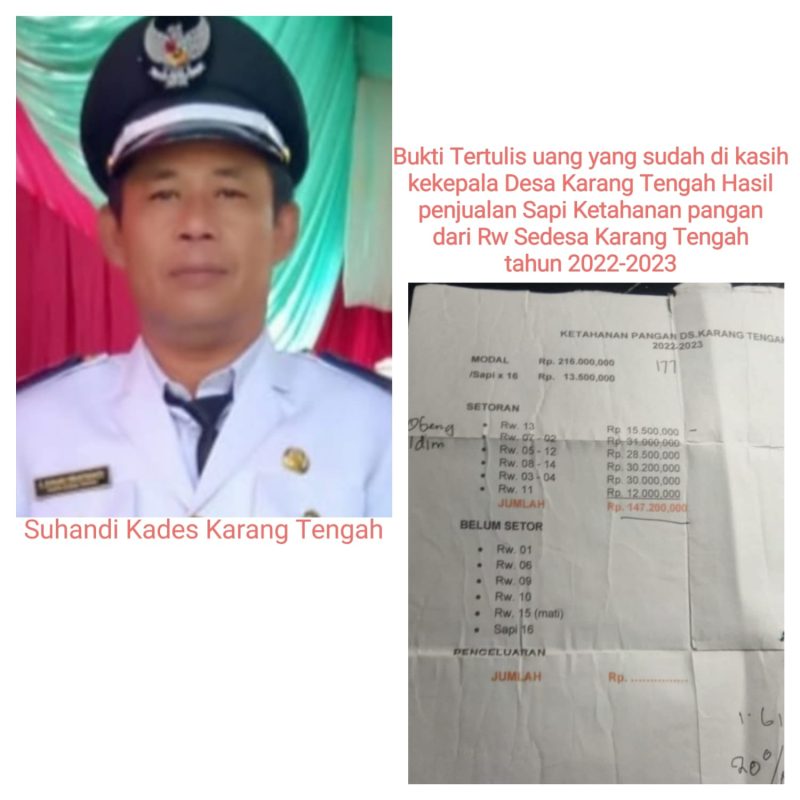 Hal ini dikatakan salah satu sumber yang tidak mau di sebut namanya ia mengatakan” Pada tahun 2022 Dana Ketahanan pangan untuk Pembelian Sapi yang di bagikan ke-setiap Rw Sedesa Karang Tengah dengan jumlah RW ada 16 Rw Per Rw Rata Rata Dikasih Dana Ketahanan Pangan Untuk 2 sapi , Namun setelah Setahun Kami menjual sapi tersebut atas perintah kades Karang Tengah dan uangya sayah kasih ke pak sekdes Karang Tengah mantu pak kades, Setelah itu sayah tidak tau uang nya di kemana in”ucap sumber.
