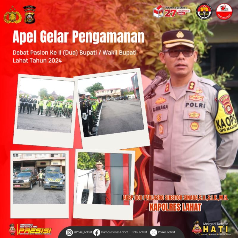 Lahat–Sumsel : Patrolinews86.com – Rabu 20 nopember 2024, Kapolres Lahat AKBP God Parlasro S. Sinaga SH.SIK.MH, Memimpin Apel persiapan pengamanan menjelang Debat publik ke II ( dua ) pasangan calon Bupati dan Wakil Bupati Lahat 2024.