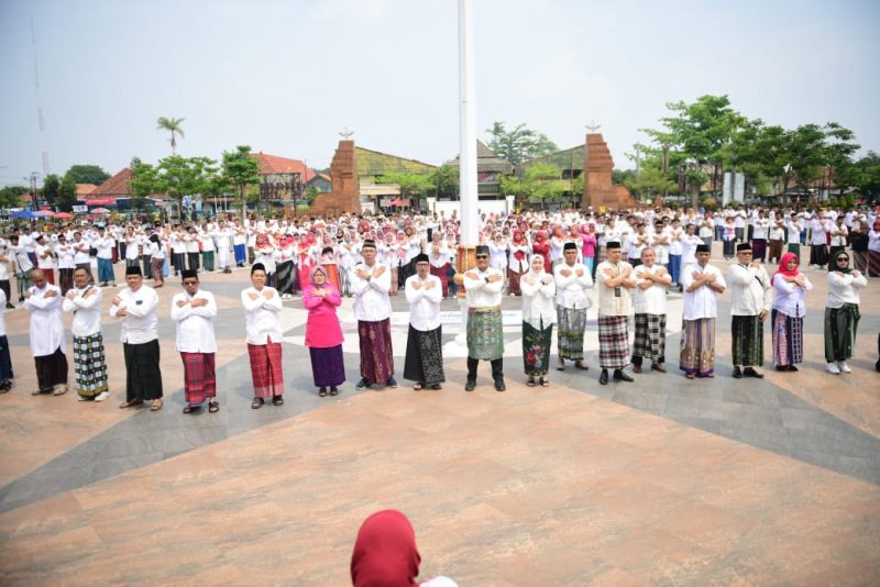 Ribuan ASN Pemkab Indramayu Ikuti Pemecahan Rekor MURI Pemakaian Sarung Tenun Terbanyak