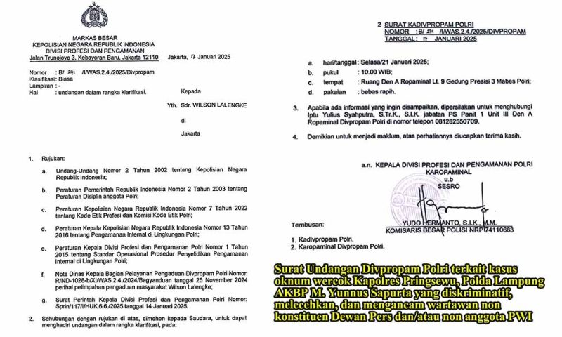 Jakarta – Propam Polri mengundang Ketua Umum Persatuan Pewarta Warga Indonesia (Ketum PPWI), Wilson Lalengke, dalam rangka klarifikasi terkait laporannya tentang Kapolres Pringsewu yang sudah melecehkan profesi jurnalis serta mengancam mengusir wartawan dari wilayah kerjanya. Sebagaimana diberitakan sebelumnya, perilaku buruk oknum Kapolres Pringsewu, AKBP M. Yunnus Saputra, dilaporkan oleh Ketum PPWI itu ke Divisi Propam Polri pada 18 November 2024 lalu.