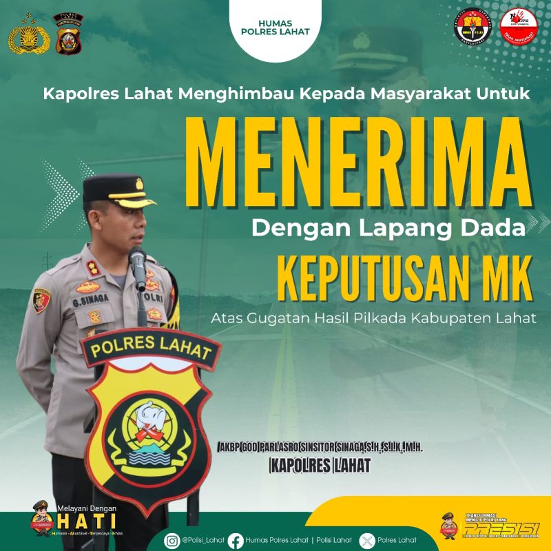 Masyarakat Kabupaten Lahat diimbau untuk tetap tenang dan menghormati proses hukum yang sedang berlangsung. Aparat juga mengingatkan agar tidak mudah terprovokasi oleh berita yang belum tentu benar, serta menunggu hasil keputusan MK dengan sikap yang dewasa dan tertib.
