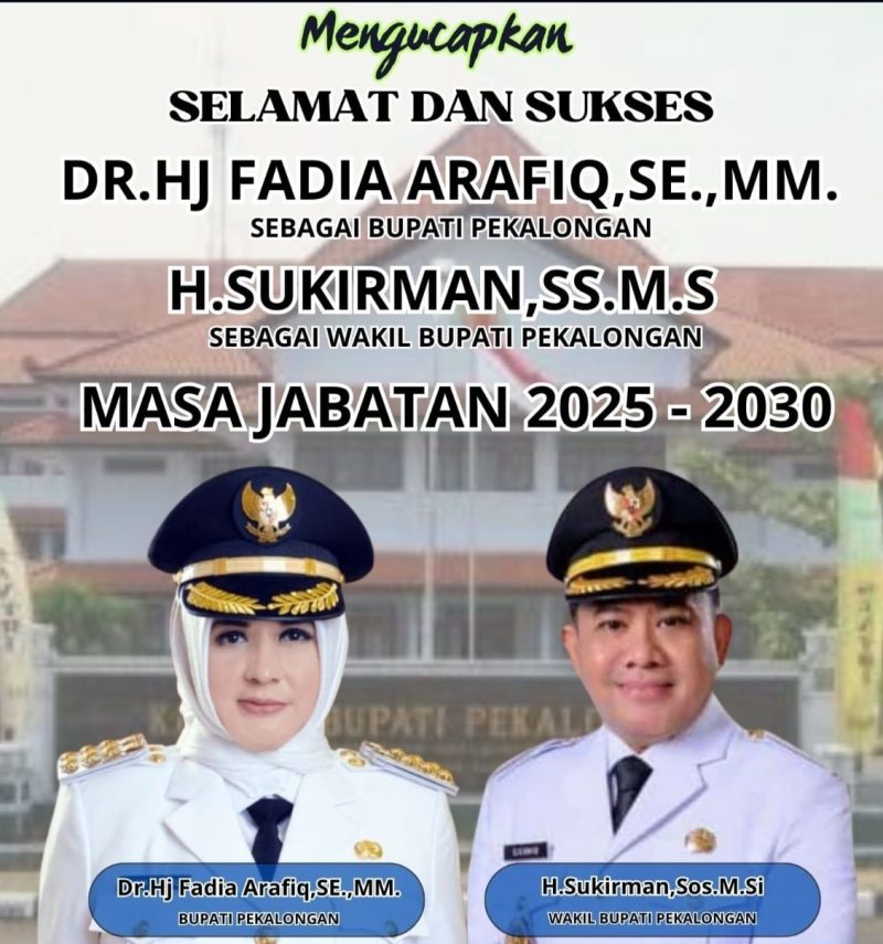 Pekalongan – Patrolinewa86.com – Pelantikan Bupati dan Wakil Bupati Pekalongan terpilih pada pemilu kepala Daerah serentak Pilkada tahun 2024 Dr Hj Fadia Arafiq SE,.MM dan H.Sukirman SS,.MM dilaksanakan tanggal 20 Pebruari 2025 di Istana negara Jakarta.