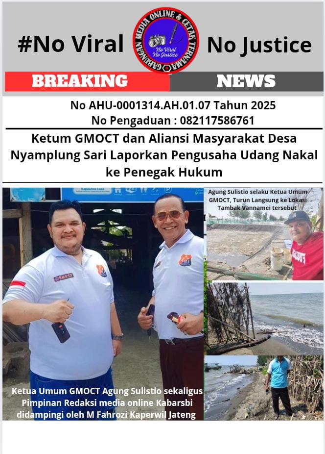 Pemalang, Jawa Tengah (GMOCT) – Gabungan Media Online dan Cetak Ternama (GMOCT), yang mendapatkan informasi dari media online Kabarsbi (anggota GMOCT), akan berkolaborasi dengan aliansi masyarakat Desa Nyamplung Sari untuk melaporkan pengusaha udang vaname ke pihak berwajib. Laporan ini terkait dugaan pelanggaran hukum dan kerugian yang dialami masyarakat akibat aktivitas tambak udang yang diduga tidak memiliki izin dan mencemari lingkungan.