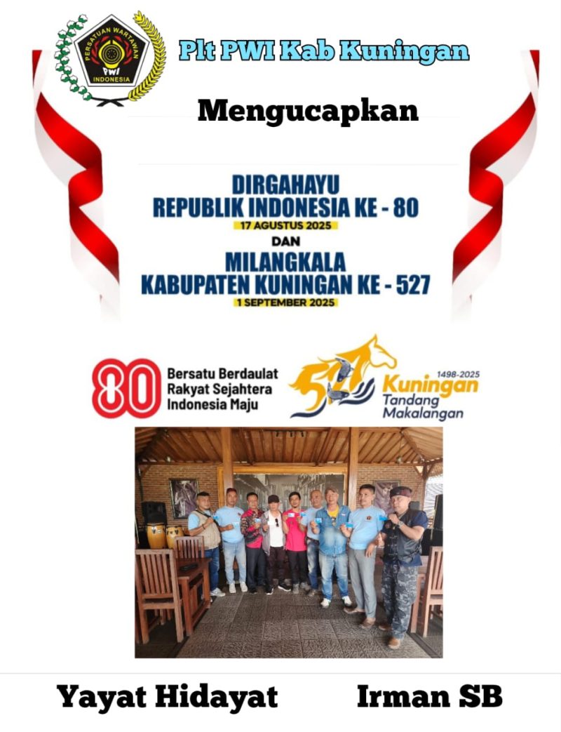 Keluarga Besar Persatuan Wartawan Indonesia(PWI) Kuningan beserta Jajaran Mengucapkan Dirgahayu Republik Indonesia Ke-80 17 Agustus 1945 dengan semangat ” Bersatu Berdaulat Rakyat Sejahtera Indonesia Maju”.