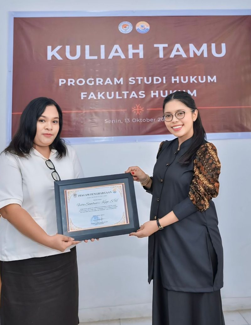 Beliau menambahkan “Program Studi Hukum sangat mengapresiasi terselenggaranya kuliah tamu yang menghadirkan praktisi hukum, Ibu Fista Sambuari Kago S.H yang merupakan pengacara di kantor Law Firm Hotman Paris & Partner, yang membawakan materi mengenai Perlindungan Hukum terhadap Perempuan dan Anak dalam Upaya Pencegahan dan Penindakan.