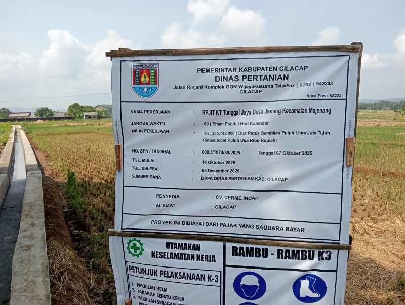 Proyek infrastruktur pertanian senilai Rp. 295.742.000 yang didanai oleh DPPA (Dana Perimbangan Pembangunan Daerah) Dinas Pertanian Kabupaten Cilacap ini ditargetkan selesai pada 05 Desember 2025, setelah dimulai pada 14 Oktober 2025. Proyek ini disambut antusias oleh petani lokal, yang berharap besar pada peningkatan produktivitas hasil panen.selasa
