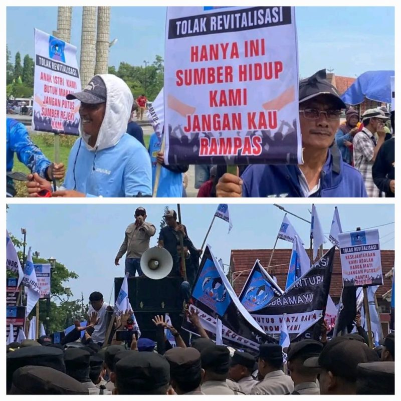 Petambak yang tergabung dalam Koalisi Masyarakat Pesisir Indramayu (Kompi) menggelar aksi demonstrasi di Kabupaten Indramayu, Kamis (02/04/2026). Mereka menyuarakan penolakan terhadap proyek Revitalisasi Tambak Pantai Utara (Pantura) yang merupakan program dari Kementerian Kelautan dan Perikanan (KKP).