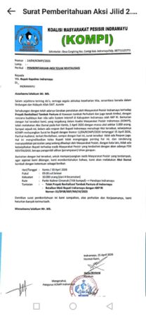 Dalam surat pemberitahuan (ijin) demo yang ditunjukan ke Kapolres Indramayu bernomor 14/04/KOMPI/2026 itu, KOMPI juga menyertakan tuntutan secara khusus ke Bupati Indramayu, Lucky Hakim yakni “Batalkan MoU Bupati Indramayu dengan KKP RI Nomor : 01/DPJB/KKP/NIK/VI/2025”.